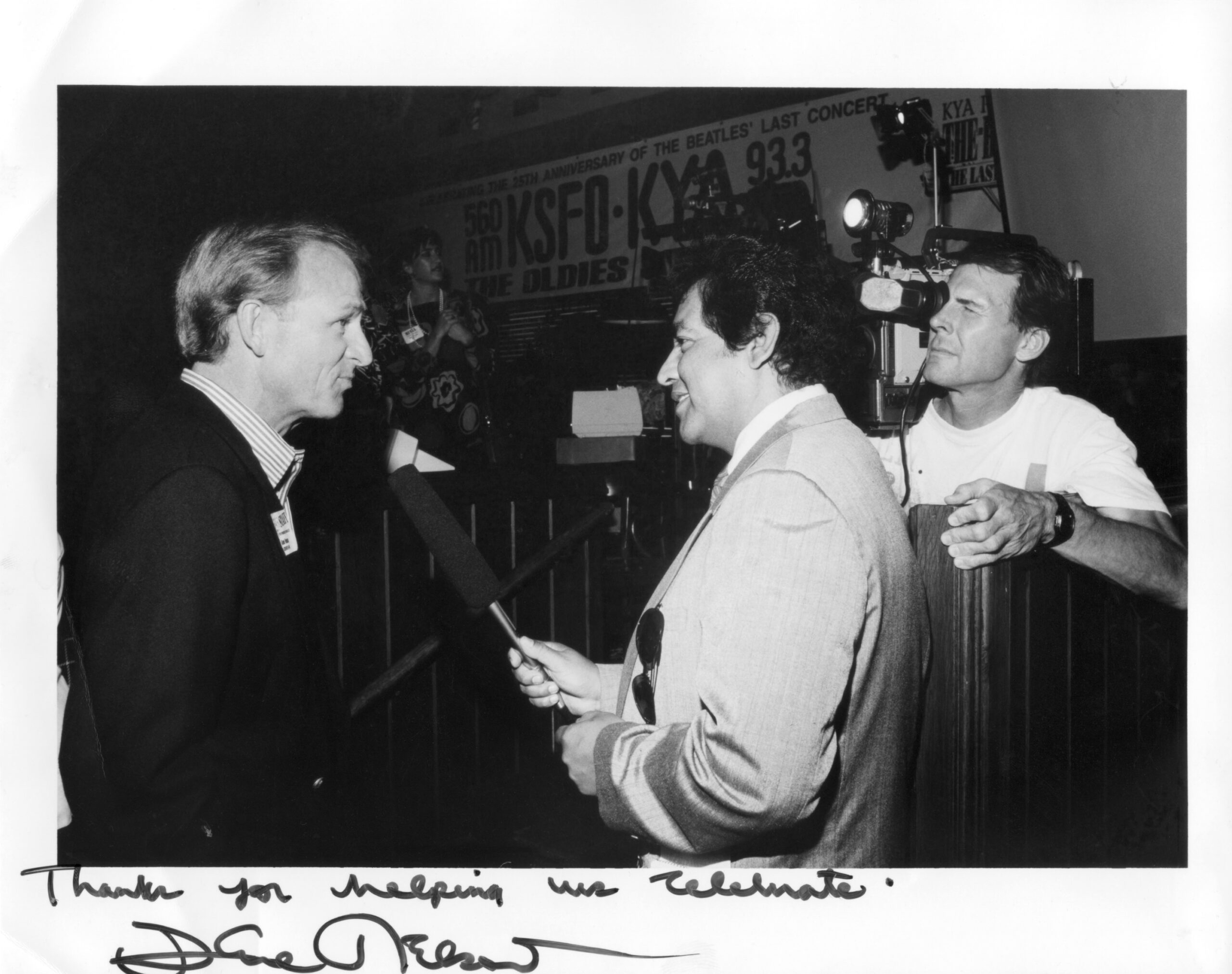 KYA announcer Gene Nelson interviewed by KICU-TV reporter Mario Del Castillo (camera operator is David Koehn) at Hard Rock Cafe, San Francisco, 1991. Event marking 25th anniversary of last Beatles concert (Candlestick Park) at which Nelson was MC. Photo courtesy David Koehn. Nelson autograph with message “Thank you for helping us celebrate”