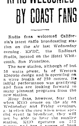 For information of radio fans, KFRC is broadcasting on 280 meters. This is within two meters of the 278 meter wavelength of KFSG, Angelus Temple, Los Angeles. For that reason, and to present interference, especially for receiving points located between San Francisco and Los Angeles, KFRC’s wave has been made very sharp. This must be born in mind when tuning for the station tonight. If it is found to be too sharp for practical reception it will be broadened later.