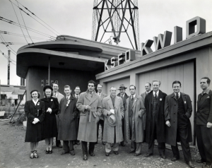 Unidentified members of the staffs of KSFO (560 kc. AM) and international shortwave station KWID, both operated by The Associated Broadcasters, are shown at the stations’ shared transmitter site near Islais Creek in San Francisco in this undated photograph. (Staff from the Office of War Information, which advocated the creation of KWID, may also be present in this photograph.)