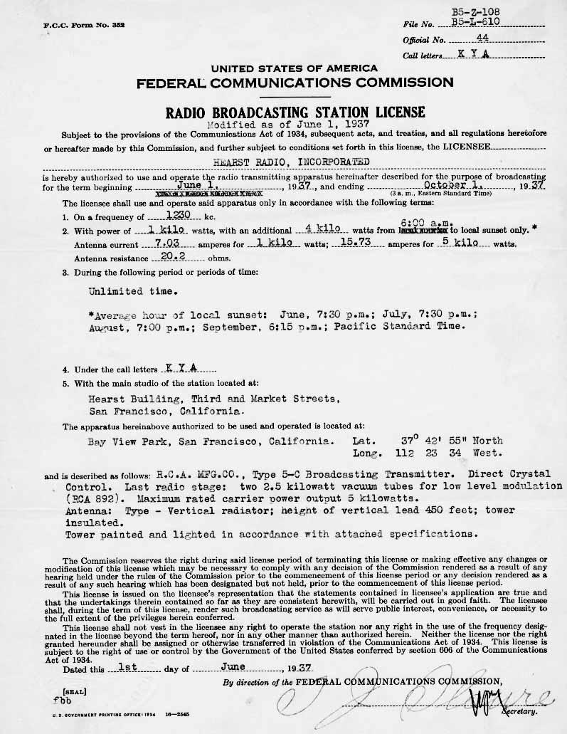 Radio station KYA’s broadcasting station license from the FCC, dated June 1, 1937. At this time, KYA operated on 1230 kc. with 5,000 watts during daytime hours (6 a.m. to local sunset) and 1,000 watts at night from its transmitter site at Bay View Park on Candlestick Hill. The station’s main studios were located in the Hearst Building at Third and Market Streets in San Francisco.