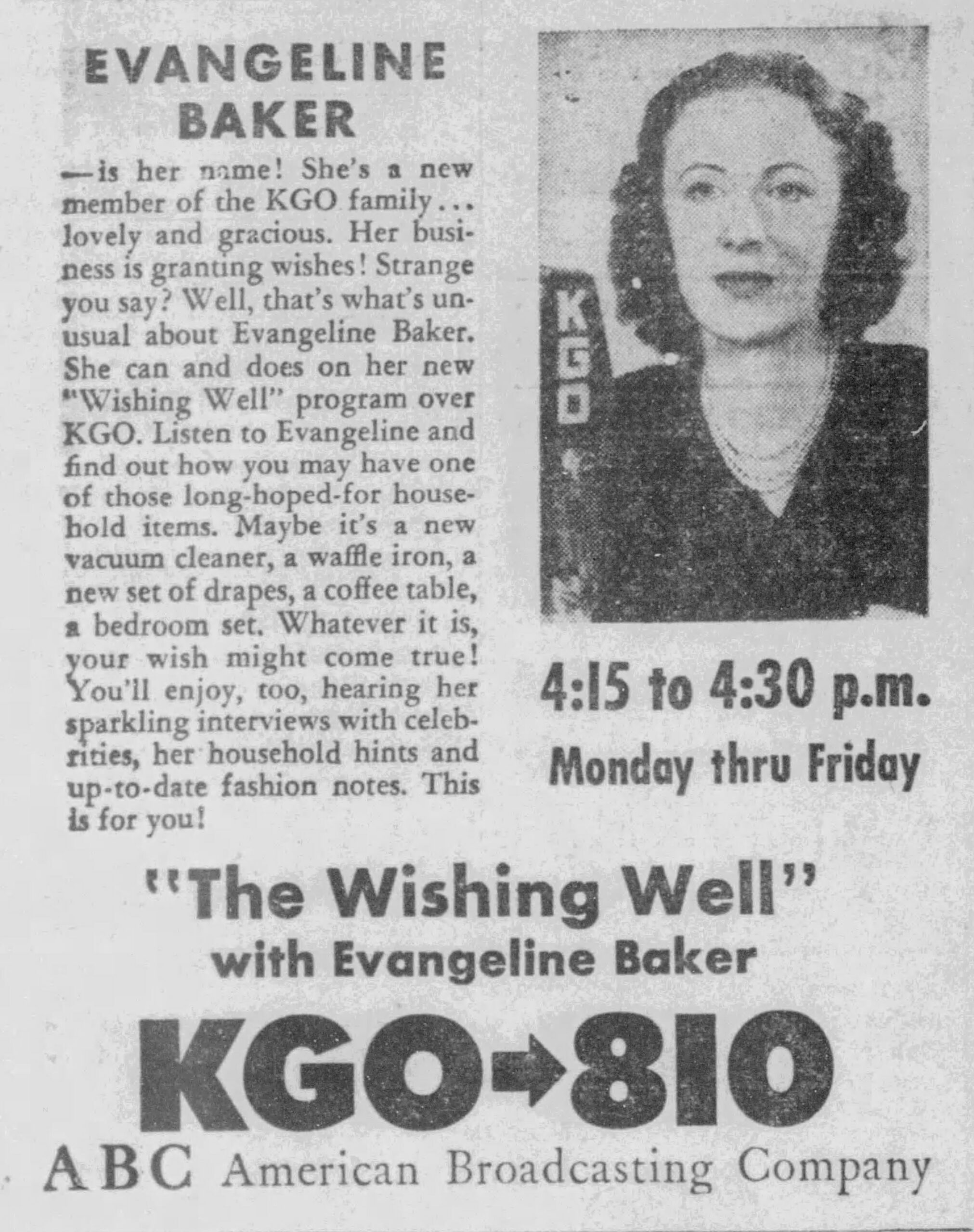 By the time of World War 2, she’d developed a strong reputation as an interviewer and commentator. She had quite a work ethic, too: she once reportedly produced 29 live interviews in a single week. The Sacramento Union reported in a 1947 feature that Baker had decided she was afraid of sounding “sing-song” if she used carefully-prepared scripts, so she worked exclusively ad-lib.