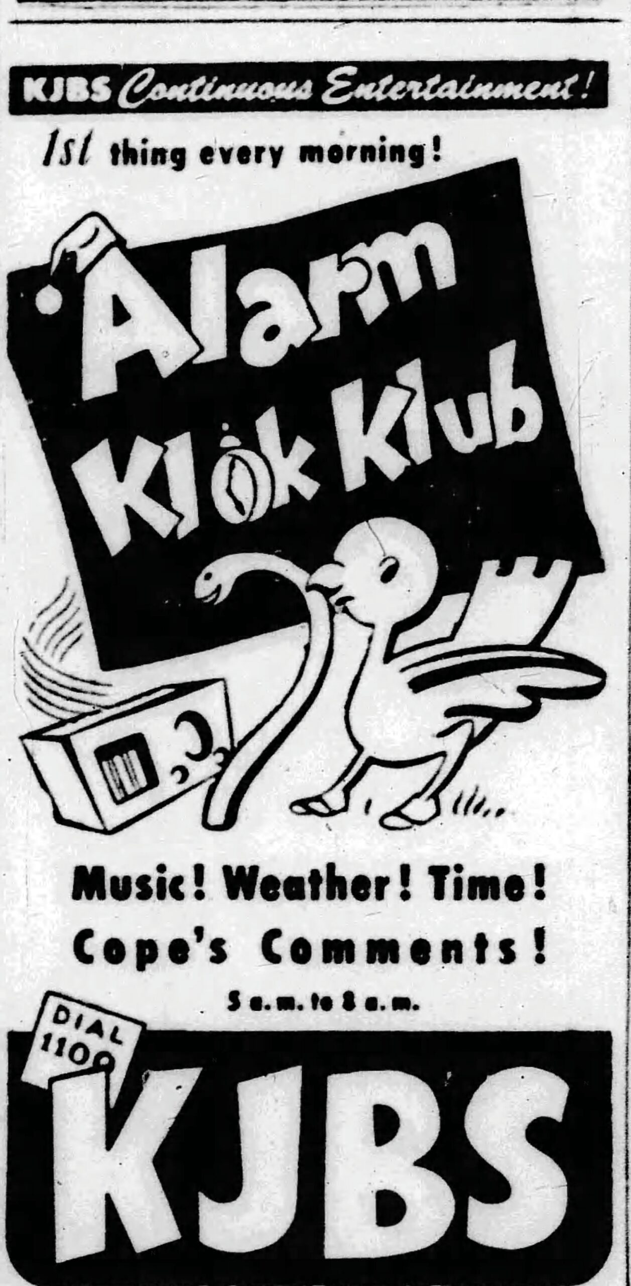 Radio historian John Schneider wrote, “Cope was probably the world’s first bona fide disk jockey, and his daily five to eight AM “Alarm Klok Klub” was San Francisco’s most popular radio program for nearly twenty five years…Although Arthur Godfrey is often given credit for being the first radio personality to ad lib commercials and kid his sponsors, Frank Cope was doing all this on KJBS in the 1930’s.”
