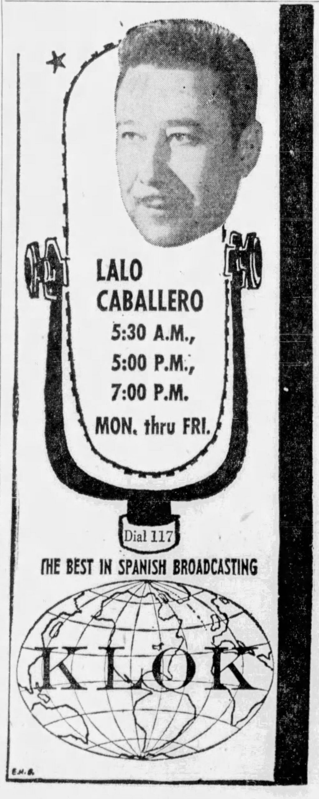 One of the first true legends of Spanish-language radio in America, “Lalo” Caballero was the number one disc jockey and promoter of conjunto music on the local airwaves, most notably at KLOK and KEEN.