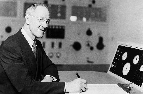 Joseph Baker, KNBC Chief Engineer, photographed on January 20, 1947. KNBC’s 50,000-watt General Electric transmitter is in the background. (Late in its life, the transmitter’s panels had been re-painted from black to a light umber brown.