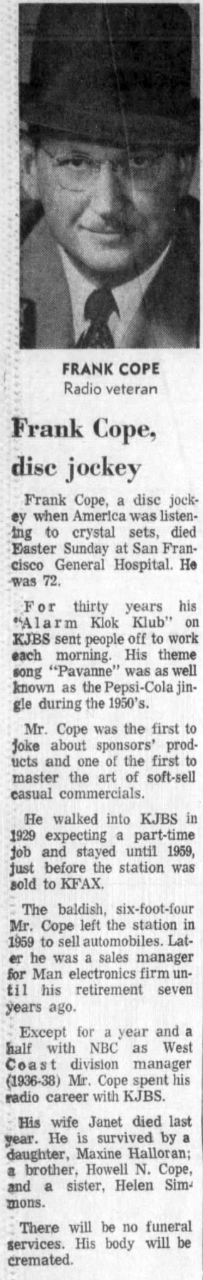 Frank Cope was elected to the Bay Area Radio Hall of Fame in 2007. He passed away in April 1974 at the age of 72. His obituary from the San Francisco Examiner appears below.