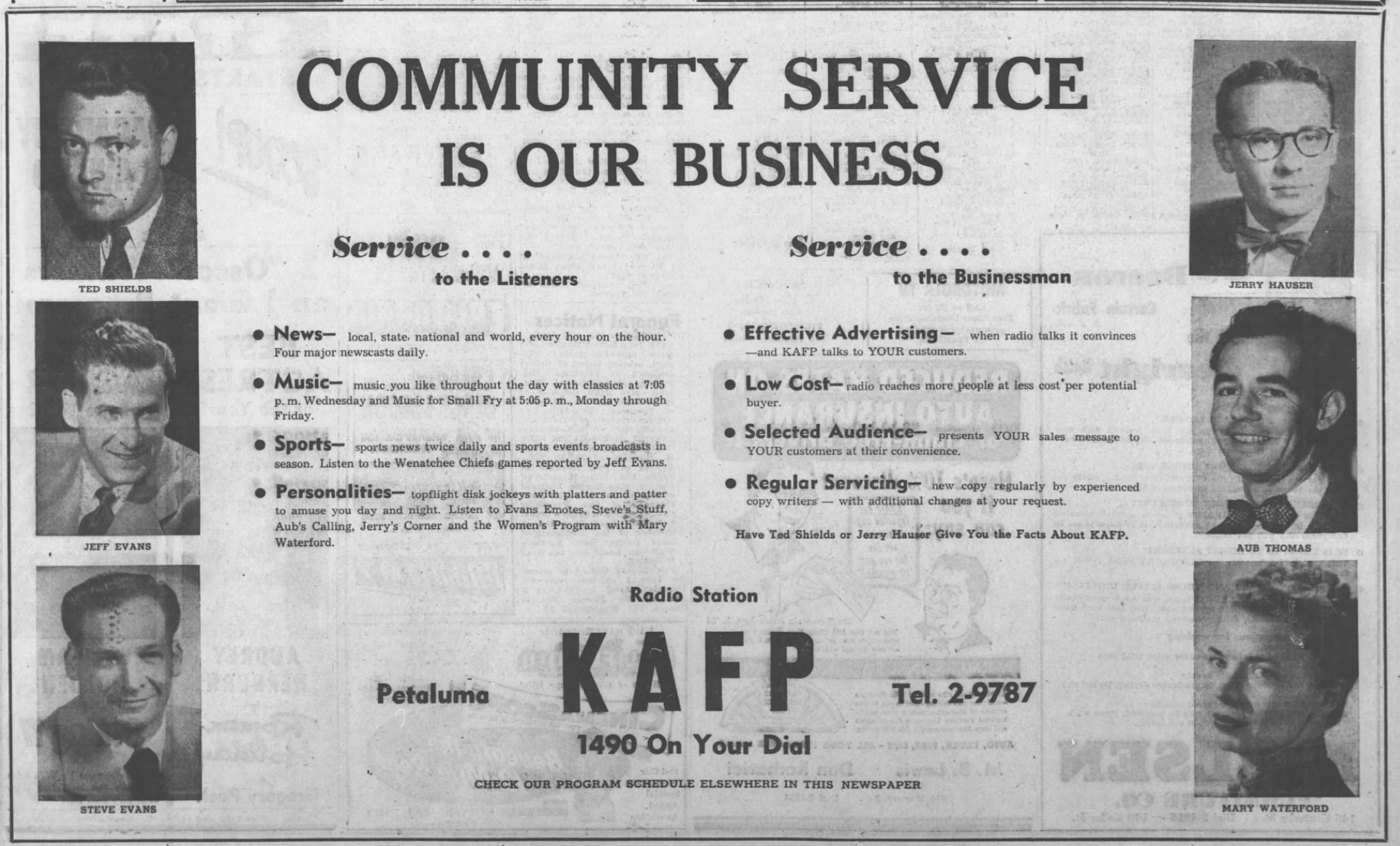 Under program director Al Daneri and general manager Charlie Powers, KAFP was soon recruiting talent, calling itself “Sonoma/Marin’s top music station”. By late 1958, Santa Rosa’s KJAX was on the air, heating up competition in the market.