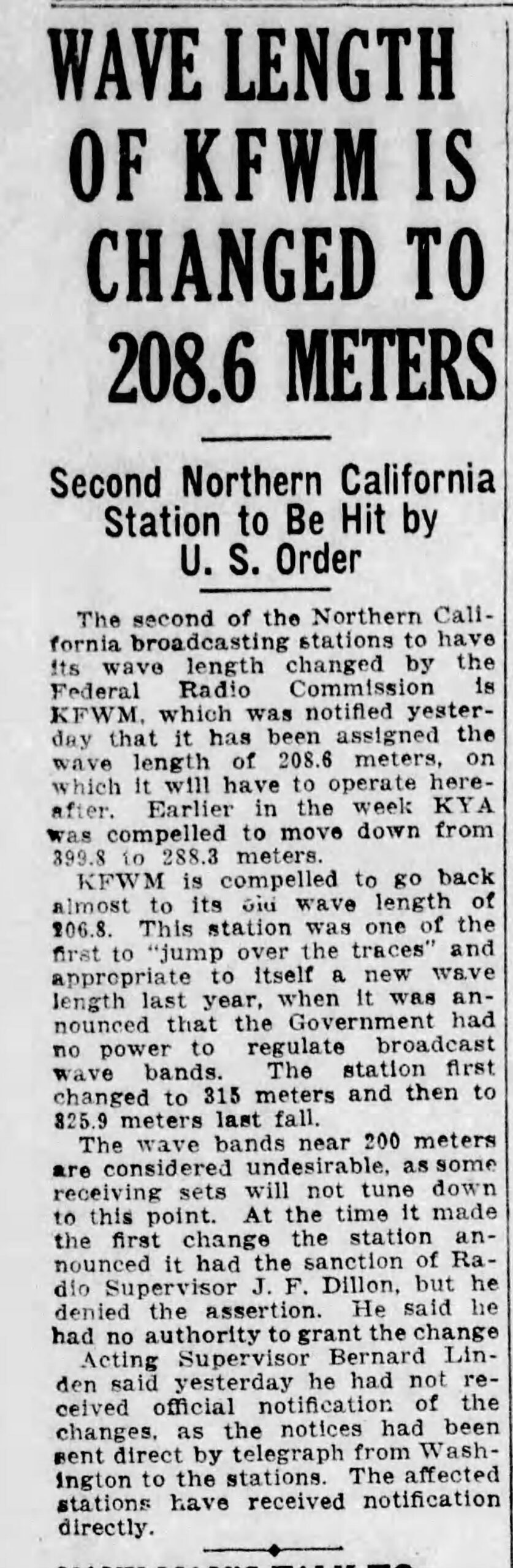 In April 1927, the Federal Radio Commission ordered KFWM to park itself at the 208.6 meter frequency (1440 kHz).