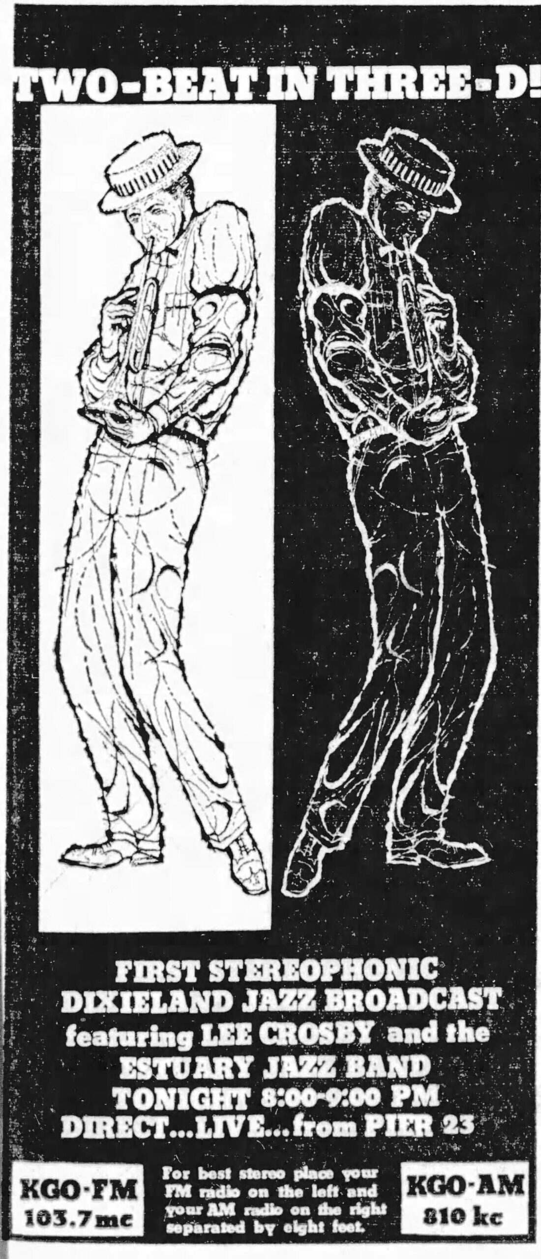For the next dozen years, KGO-FM was largely a simulcast of KGO. San Francisco Examiner columnist Dwight Newton mocked this in 1956, writing “KGO-FM programming has the imagination of a turtle, nothing but AM duplications.” Every so often, there’d be a creative effort such as the 1959 live “stereo” broadcast in which listeners were encouraged to tune one radio to KGO and another to KGO-FM and set them eight feet apart. Of note: that broadcast featured Dixieland bandleader Lee Crosby, who would go on to own KMPX.