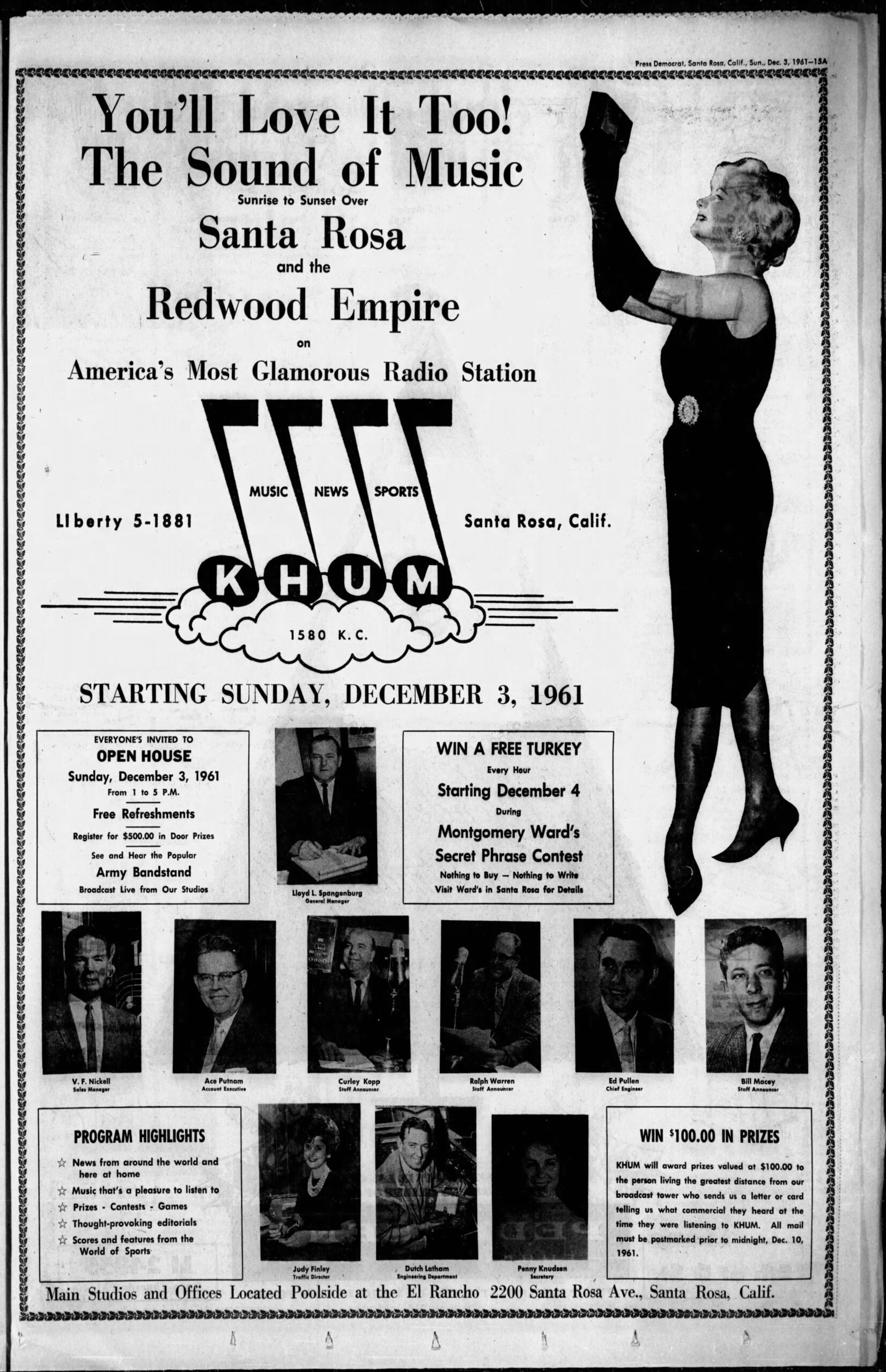 Humbly billing itself as “America’s Most Glamorous Radio Station”, KHUM began broadcasting from poolside studios at Santa Rosa’s El Rancho Hotel on December 3, 1961. The fledgling 500-watt station at the top end of the AM dial had already survived an interagency kerfuffle between the Federal Aviation Administration and the Federal Communications Commission, the result of which was an FCC demand that the station shorten its transmitter tower near the Santa Rosa airport by 58 feet.