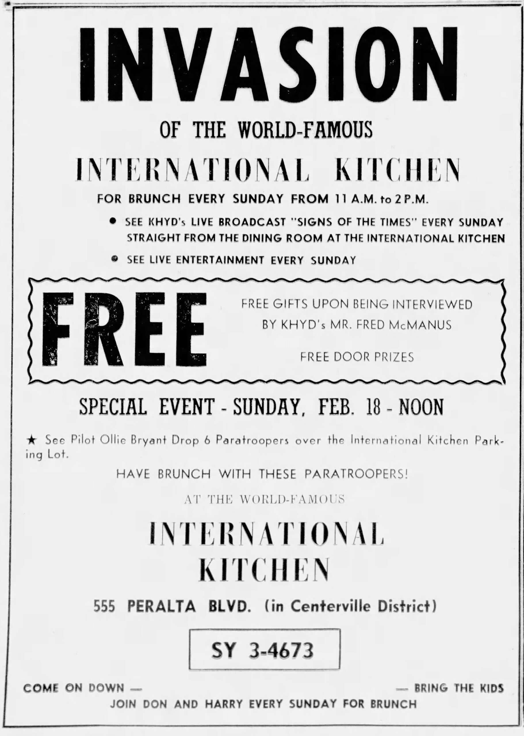 The San Francisco Examiner heralded the arrival of KHYD with the words, “booming FM radio gets another Bay Area outlet.” KHYD went on the air in early 1961 with studios at the popular International Kitchen restaurant in the Niles district of Fremont. The 1,000 watt signal emanated from a transmitter site in the Fremont hills.