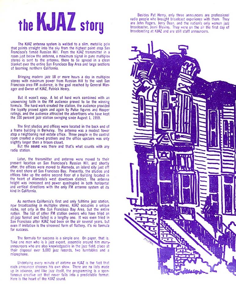 KJAZ went on the air on August 1, 1959, becoming the first commercial Bay Area station to exclusively play jazz music. The founders were Los Angeles radio promotional veteran Dave Larsen and Pat Henry, who had played jazz records on Oakland station KROW, starting in the 1940’s, and had been named “Jazz Broadcaster of the Year” by Metronome Magazine in 1956. After buying out Larsen a year later, Henry ran KJAZ for years with a keen personal sense of what was “in” and what wasn’t.