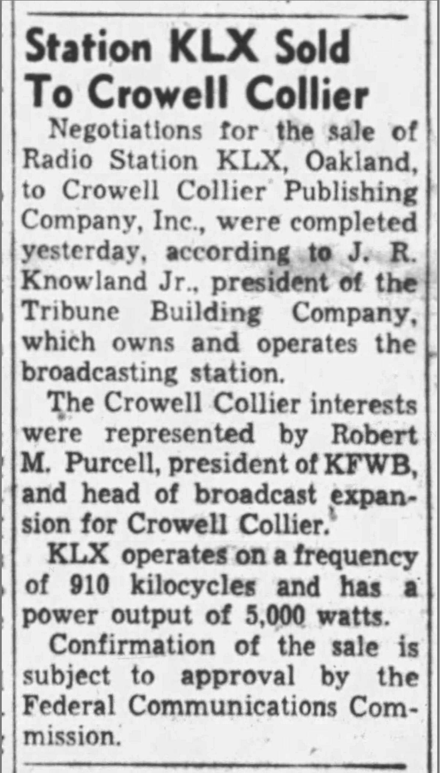 After all the words printed by the Oakland Tribune about KLX over the years, the story of the station’s sale published on March 24, 1959 was brief. KLX was being sold (the price was later revealed to be $750,000) to the Crowell-Collier Publishing Company, a venerable magazine publisher that had gotten into the radio business. Crowell-Collier owned KFWB in Los Angeles and KDWB in Minneapolis and would change the call letters of its Oakland station to KEWB.