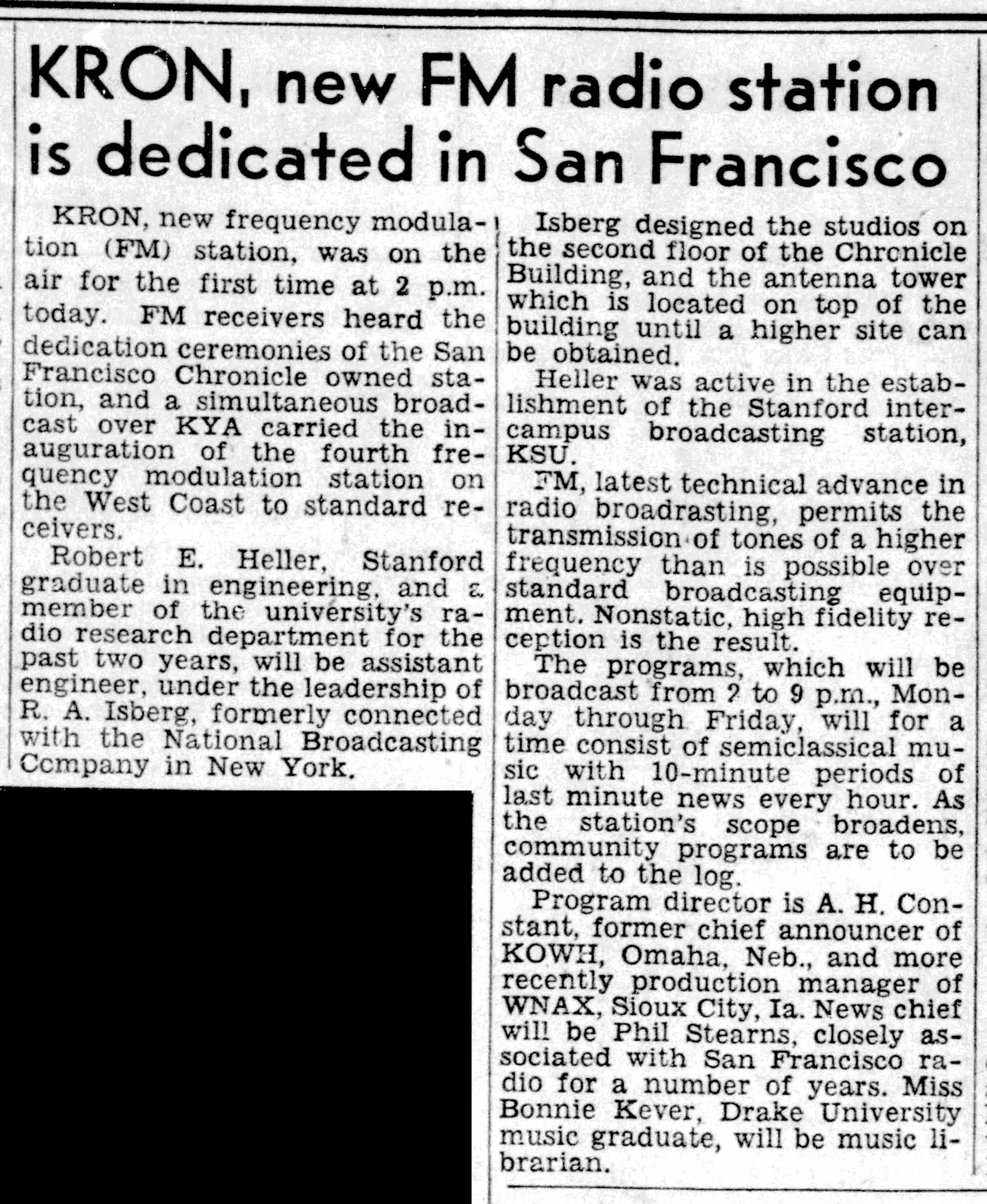 KRON-FM was firmly ensconced at Fifth and Mission Streets in San Francisco. Studios were on the second floor of the Chronicle building; the original transmitter and antenna were on the roof.