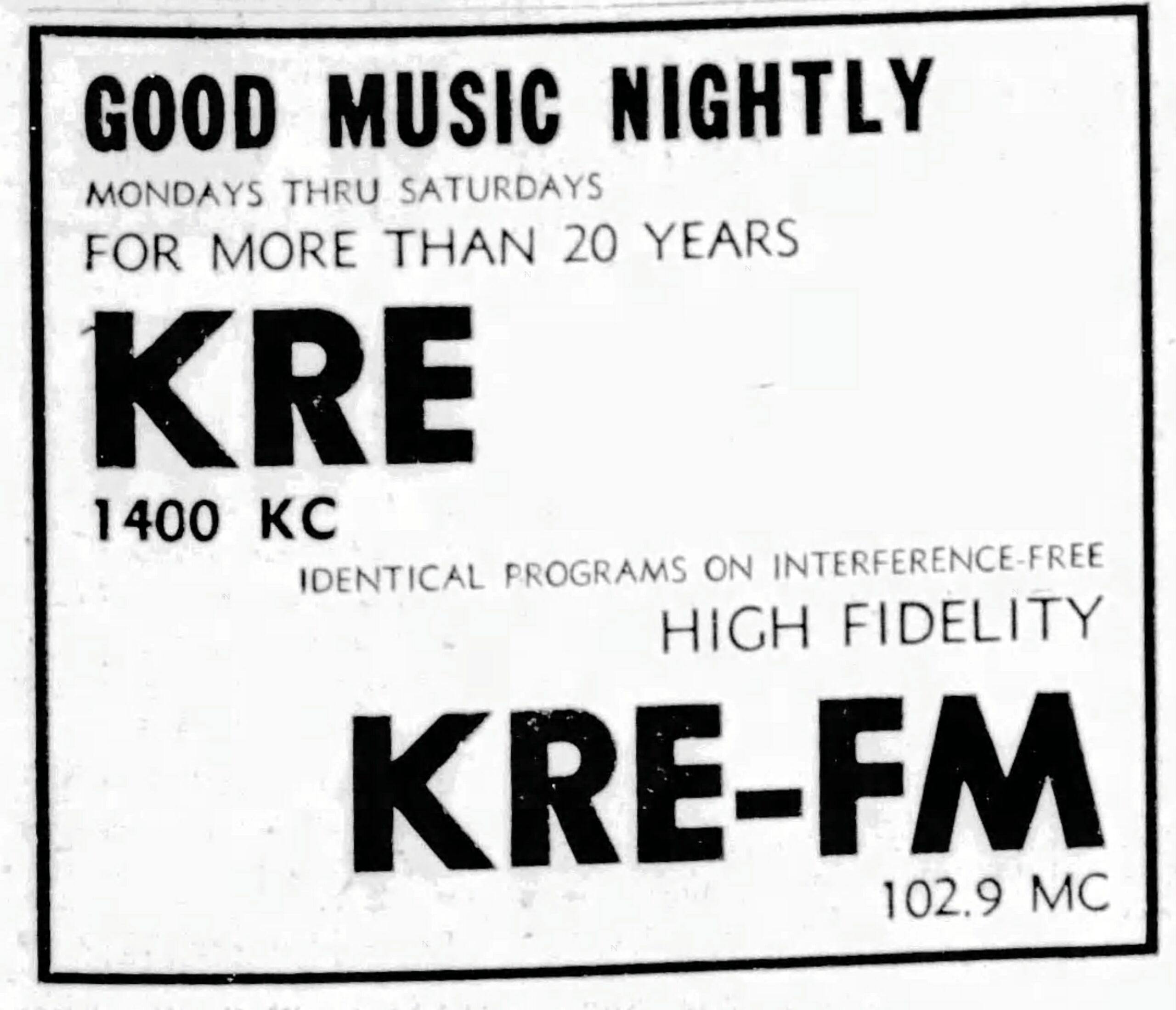 Still simulcasting with KRE, KRE-FM became part of the stereo broadcasting boom in 1957 as the stations broadcast one channel on AM and the other on FM. FM multiplexing wasn’t approved until 1959; at that time, KRE-FM adopted the new technology and programs with names like Stereo Concert began to appear in newspaper radio listings.