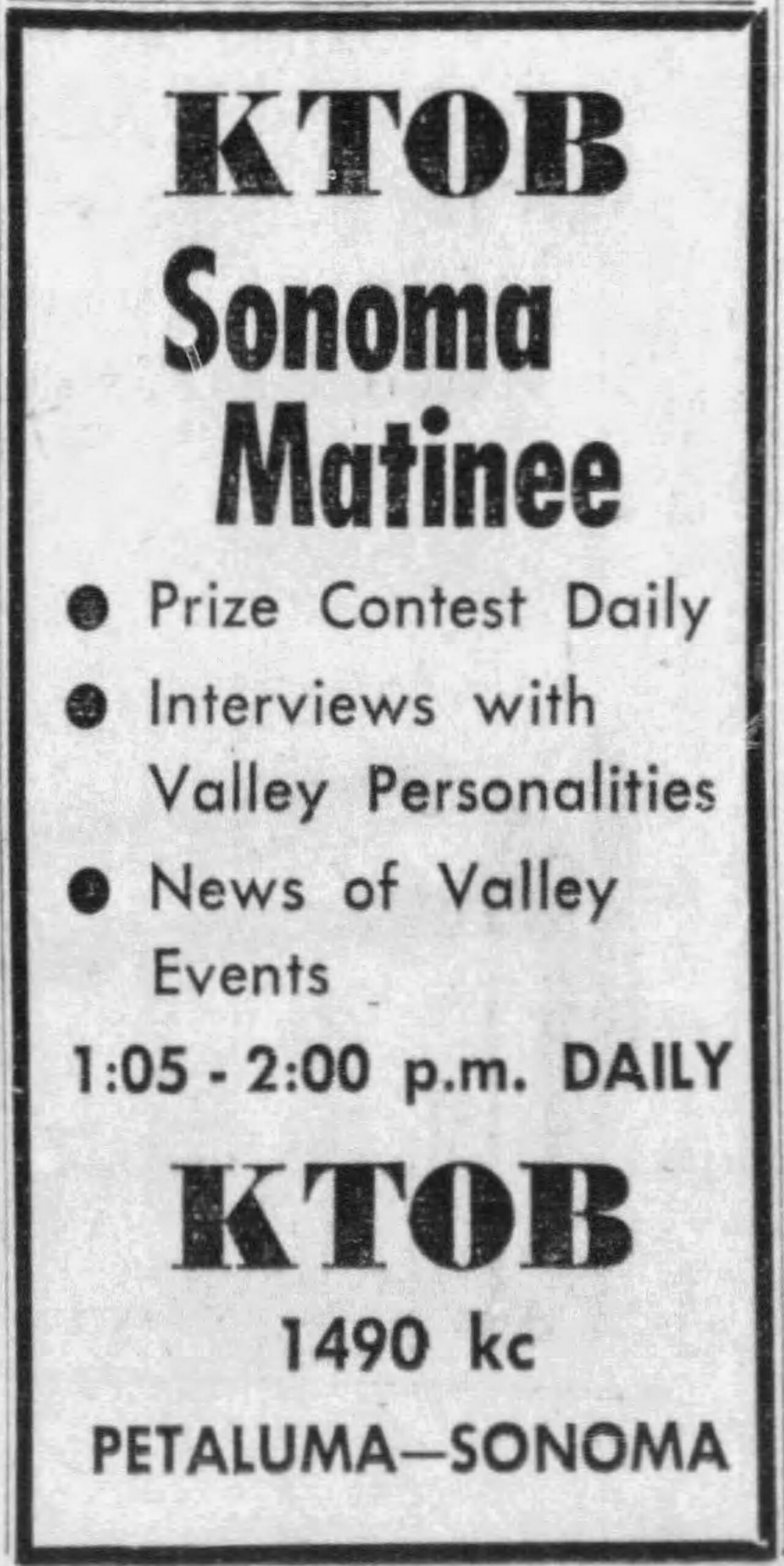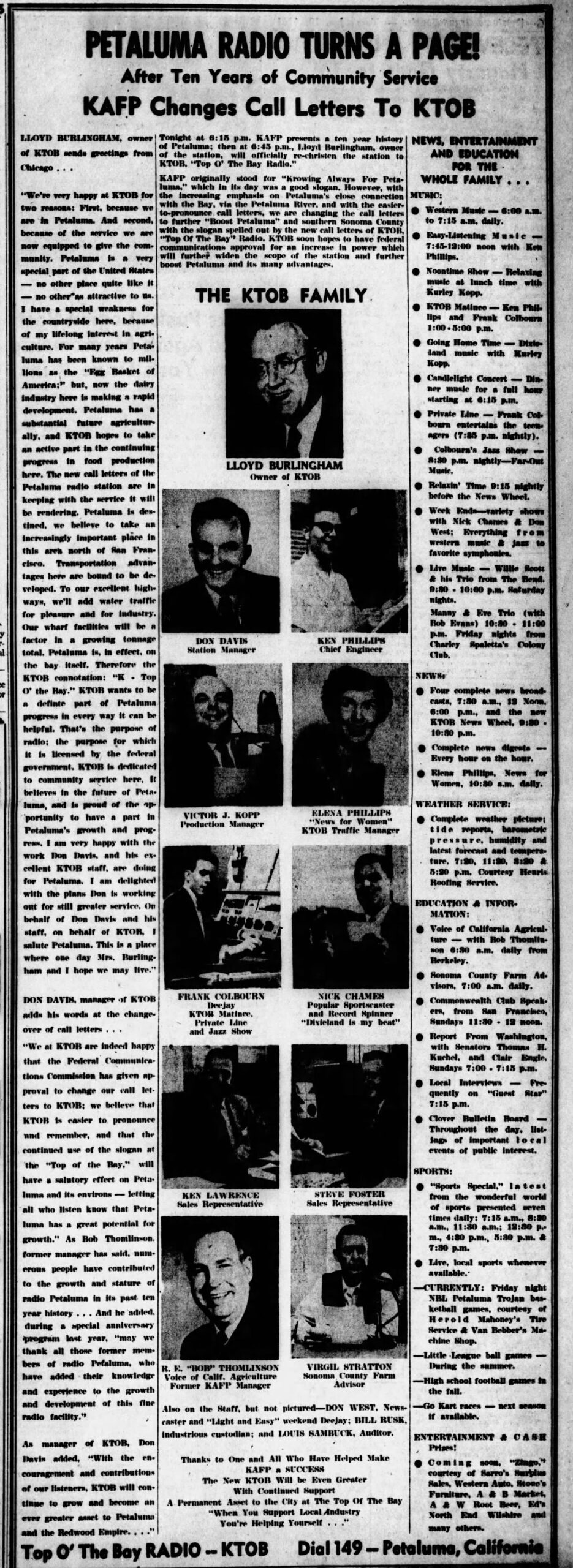 On the occasion of the call letter change (where KAFP had stood for Krowing Always For Petaluma, KTOB stood for Top Of the Bay, a reference to Petaluma’s geographical location at the mouth of the Petaluma River), Burlingham took out an ad in the Petaluma Argus-Courier, introducing the station’s staff. The ad included this line: “Thanks to one and all who have helped make KAFP a SUCCESS…the new KTOB will be even greater.”