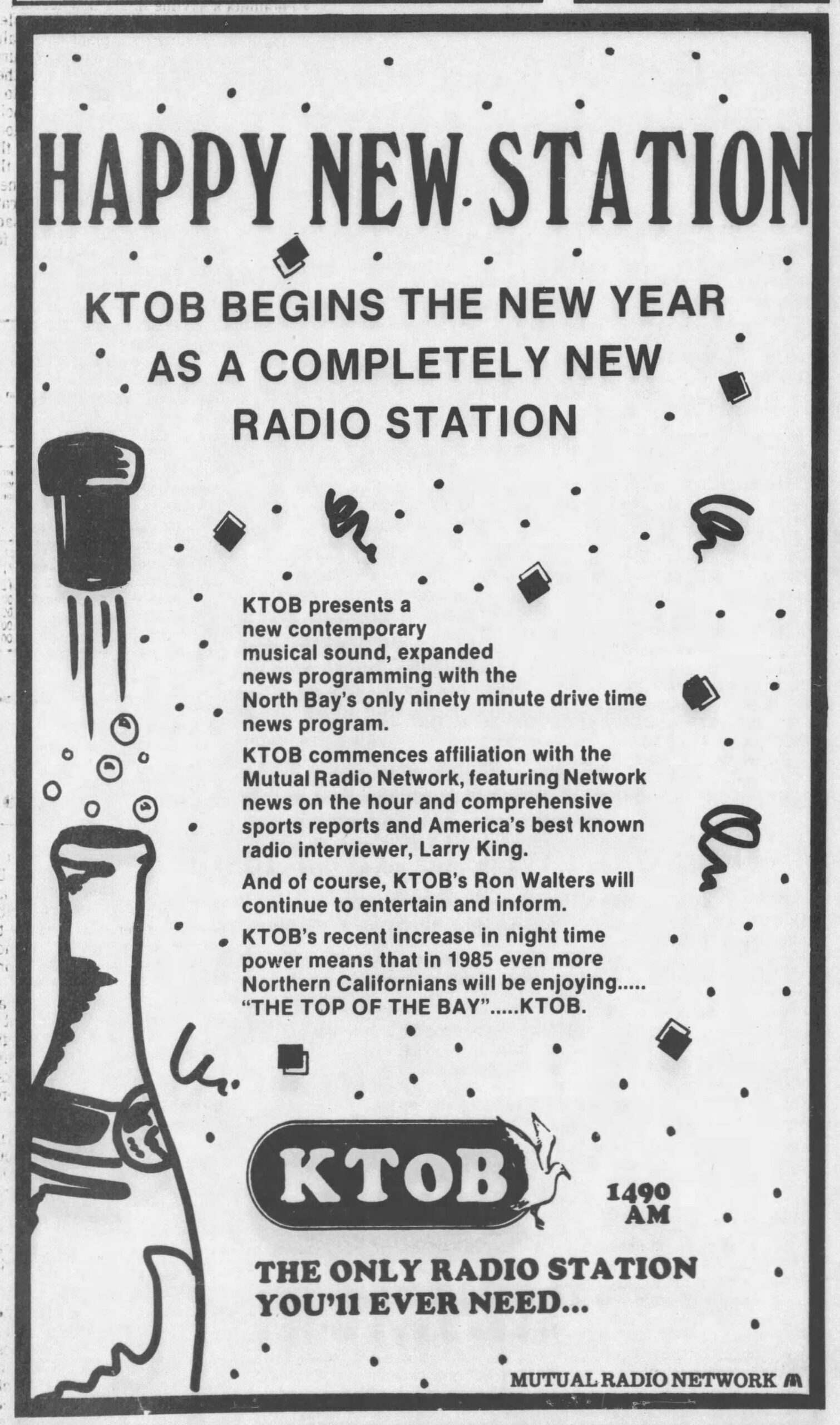 In the mid-1980s, KTOB decided to up its game. The station got FCC approval to boost its signal from 250 to 1,000 watts and brought in Al Sturges to run things. Sturges had owned a station in Santa Maria, and among other things, he arranged an affiliation with Mutual Radio (bringing The Larry King Show to Petaluma) and launched local traffic reports to start 1985. The station tightened its musical offerings to aim at the coveted 25-54 age group. Sturges also oversaw an increased focus on local news coverage, at a time when Sonoma County ratings indicated San Francisco stations were dominant.