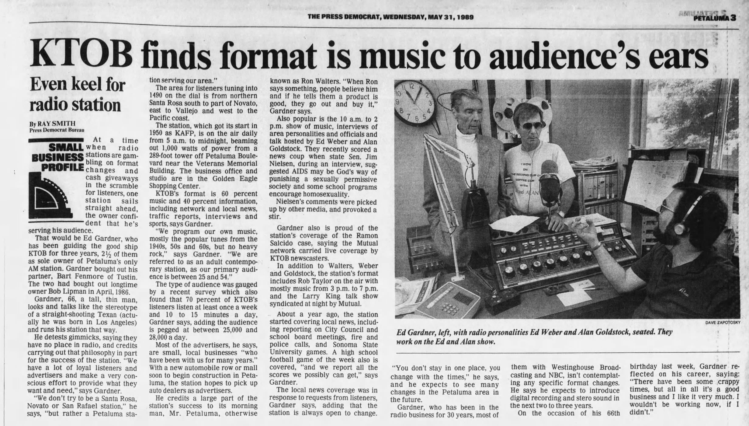 In July 1989, just weeks after a laudatory article about KTOB in The Press Democrat, Ed Gardner died. He’d been battling cancer, and his death presaged another challenging chapter in KTOB’s history.